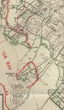 On 1 November, the assault of Umbrella Hilla sand dune two thousand yards (1,800 m) south–west of Gaza to the west of the Rafa to Gaza road overlooking the main objectiveswas to begin at 23:00.[37][38][50] The defending garrison was "assumed to be about 350 strong".[40] However, at 10:50 a preliminary move into No Man's Land was observed by Ottoman soldiers in Fisher's Orchard, who gave the alarm and began firing machine guns and rifles from the Ottoman trenches on Umbrella Hill.[51] At 23:00, an intense EEF bombardment began enabling a tape to be laid, along which the attacking troops formed up to launch their attack ten minutes later.[51] Under cover of the intense ten-minute bombardment, the 1/7th Battalion, Scottish Rifles with one company of 1/8th Battalion, Scottish Rifles (156th Brigade, 52nd (Lowland) Division) attacked Umbrella Hill.[49] After killing many of the defenders, they quickly captured the hill, three officers, fifty-five Ottoman soldiers, three Lewis guns and numerous bombs. The attackers suffered light casualties; however the sand dune was difficult to defend because the Ottoman trencheswithout revetmentshad virtually disappeared during the previous bombardments. The following Ottoman bombardment of Umbrella Hill caused 103 casualties to the 1/7th Battalion Scottish Rifles during the next twenty-four hours.[51] However, with the hill captured by the 52nd (Lowland) Division, the main attack could begin.[37]