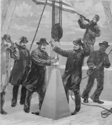 He also was on several boards: to study the effect of a dry dock companies work on Portland Harbour in April 1868, to make torpedo cable contracts and examine systems of torpedo defence from May 26 to October 13, 1873, to advise on the ventilation of the United States House of Representatives March 1877 to March 1881, and February 15, 1884, to September 1886, and to advise on public works in the District of Columbia from 1879 to 1888. Casey supervised the construction of a monument over Thomas Jefferson's grave May 2, 1882, to October 20, 1886, one at Washington's Headquarters in Newburgh, New York from June 7, 1883, to October 20, 1884, and one marking the birthplace of Washington, from October 8, 1883, to Oct. 20, 1886. He was made a full colonel on March 12, 1884.[6]