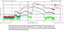 Proton flux due to Solar flares, January 2005- A series of strong solar flares disrupted data taking for several days. On January 17 a very powerful radiation storm created multi-bit errors in the onboard computer memory, and saturated the telescope detectors so that GP-B lost track of the guide star. The science team, however, is confident that the temporary loss of science data will have no significant effect on the results. On January 20 the high level of proton flux was still generating "single bit errors" in GP-B memory, but the telescope is locked on the guide star again, and the gyroscope electronics seem to perform nominally.