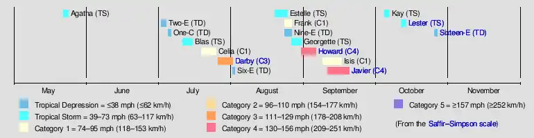 The 2004 season got off to an early start with Tropical Storm Agatha, which formed a week after the season began.[4] No tropical cyclones were active in June, the first such occurrence since 1969.[5] July was more active, producing four tropical cyclones. Three of these (Blas, Celia, and Darby) became named storms, two (Celia and Darby) became hurricanes, and Hurricane Darby became the first major hurricane of the season.[6] Additionally, a tropical depression in the central Pacific became the only tropical cyclone to form within the Central Pacific Hurricane Center's area of responsibility during the year.[1] August was the most active month, producing six tropical cyclones, four named storms, and two hurricanes (Frank and Howard).[7] September saw a decline in activity, although all three storms that existed during the month were hurricanes, two of which (Howard and Javier) were major hurricanes. Hurricane Howard, which had formed in August, only became a major hurricane in September. Hurricane Javier – the final storm during the month – was the strongest storm of the season.[8] October saw the final three tropical cyclones of the year; two developed into named storms (Kay and Lester). Neither of these storms became hurricanes.[9]