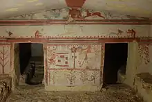 The entrance to the tomb leads to the main chamber. The back wall of the main chamber is opposite to the entrance and contains two doorways that lead to two other chambers.[5] Frescoes with brightly colored animals adorn the gabled areas at the top of the front and back walls of the chambers. These include bulls, birds, hippocampi, a panther, a lion and a goat. The back wall of main chamber is the only wall with frescoes painted below the gable.