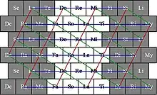 The Tonnetz can be overlayed on the Wicki–Hayden note layout, where the major second can be found half way the major third.