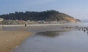Torrey Pines State Beach is a public beach located in the San Diego, California community of Torrey Pines, south of Del Mar and north of La Jolla. Coastal erosion from the adjacent Torrey Pines State Reserve makes for a picturesque landscape. It is a local favorite among surfers and remains a quintessential Southern California beach. Occurrences of bioluminescence in the waters near the beach have been noted.[1]