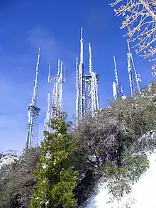 An antenna farm, satellite dish farm or dish farm is an area dedicated to television or radio telecommunications transmitting or receiving antenna equipment, such as C, Ku or Ka band satellite dish antennas, UHF/VHF/AM/FM transmitter towers or mobile cell towers.[1][2][3][4] The history of the term "antenna farm" is uncertain, but it dates to at least the 1950s.[5]