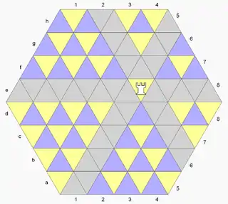 Triangular chess is a chess variant for two players invented by George R. Dekle Sr. in 1986.[1][2] The game is played on a hexagon-shaped gameboard comprising 96 triangular cells. Each player commands a full set of chess pieces in addition to three extra pawns and a unicorn.