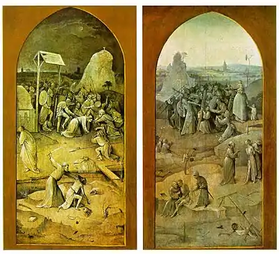 The right panel portrays Christ Carrying the Cross in the background, while the foreground depicts the two thieves, one confessing and the other refusing to convert. Around Jesus is a crowd, in which figures such as Simon of Cyrene, who is supporting the cross, and the Veronica, can be identified.[1]