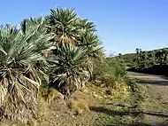 Trithrinax campestris prefers well drained, sandy or rocky soils (although it is resistant to extended persistent flooding).[2] It is very resistant to drought, and -9 °C/-15 °C temperatures when not in growing season, although it tends to shed its leaves in these conditions. It is one of the most cold-hardy palms in the world, because it also grows in the mountains of Sierras de Córdoba[3] and Sierras de San Luis; it is known that specimens growing at those elevations tolerate special cold conditions. It has thrived as far north as the British Isles.[4] Seeds germinate quickly, but later growth is mostly slow.