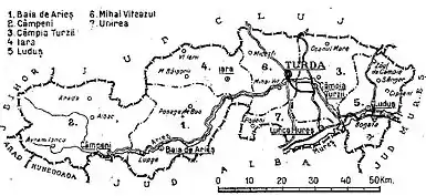 Administratively, when the territory was transferred from Hungary, Turda-Arieș County was provisionally divided in six districts (plăși):