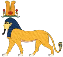 A depiction of Tutu as a lion with a human head, wearing the Double Feather crown, the Solar Disk and Ram Horns.