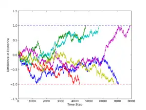 Example of six evidence accumulation sequences from an unbiased (100% noise) source. The dotted lines indicate the thresholds for decision making for each of the two alternatives.