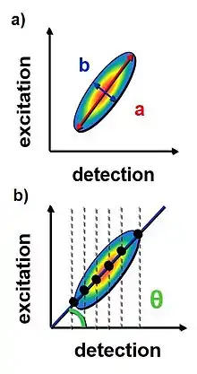 The temporal evolution of the lineshape can be evaluated with several methods. One method evaluates the linewidth along diagonal and off-diagonal line separately.[11] From the two values of the widths it is possible to calculate the flattening as where is the linewidth along diagonal line and is the linewidth along off-diagonal line. The flattening curve as a function of assumes a value close to 1 at fs ( ) and then decreases to zero at fs (). Another method is called Central Line Slope (CLS).[12][13] In this case the positions of the maximum values in the 2D spectra per each detection frequency are considered. These points are then interpolated with a linear function where is possible to extract the slope between this function and the detection axis (x axis). From a theoretical point of view, this value should be 45° when is close to zero because the peak is elongated along the diagonal line. When the peak assumes a circular lineshape, the value of the slope goes to zero. The same approach can also be used by considering the positions of the maximum values per each excitation frequency (y axis) and the slope will be 45° at fs and 90° when the shape becomes circular.[14]