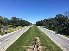 The freeway crosses Big Elk Creek into Penn Township and heads east to a diamond interchange at PA 796 north of the community of Jennersville. The route passes through a mix of fields, woods, and residential development as it continues east into London Grove Township and crosses Middle Branch White Clay Creek before it comes to a partial cloverleaf interchange at PA 841 north of the borough of West Grove. US 1 curves northeast and reaches a diamond interchange serving PA 41 northwest of the borough of Avondale. The freeway continues through rural land with some development and bends to the east, crossing the East Branch White Clay Creek, heading into New Garden Township, and coming to a partial cloverleaf interchange at Newark Road north of the community of Toughkenamon. The route heads through wooded areas with some nearby residential development and crosses West Branch Red Clay Creek before it skirts into the southern portion of East Marlborough Township, where it has a diamond interchange with PA 82 north of the borough of Kennett Square. From here, US 1 continues east and enters Kennett Township, where it crosses East Branch Red Clay Creek and passes near more development, coming to the northern terminus of the freeway at a southbound exit and northbound entrance with the Baltimore Pike.[2][3]