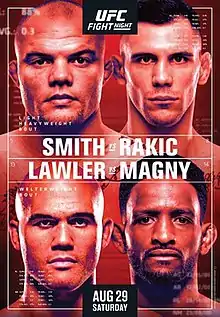 8. Nick Baldwin (2020-08-15). "Smith-Rakic promoted to UFC main event on Aug. 29". thescore.com. Retrieved 2020-08-15.