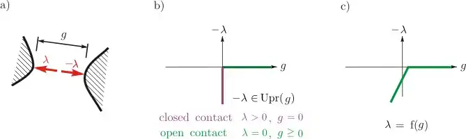 Both the expressions above represent the dynamic behaviour of unilateral constraints: on the one hand, when the normal distance is above zero, the contact is open, which means that there is no contact force between bodies, ; on the other hand, when the normal distance is equal to zero, the contact is closed, resulting in .