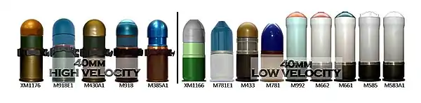 The United States Armed Forces has created a plethora of different types of 40 mm grenades in both the low-velocity 40×46 mm and high-velocity 40×53 mm calibers which uses what it calls a high-low propulsion system which keeps recoil forces within the boundaries of an infantry weapon. Presented on this page is a basic overview.