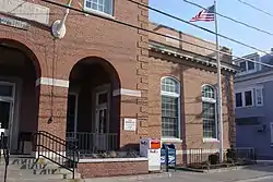 The Provincetown Post Office is located at 217 Commercial Street in Provincetown, Massachusetts. It is located in a 2+1⁄2-story brick building that was built in 1930. The main facade has a loggia-style arcade of three arches on the first level, leading to a recessed entrance. The second story has three large windows across, and the gable end has an oculus window and dentil moulding. The building is crowned by a cupola.[2]