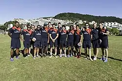 The 2012–13 Series saw a slightly different format, with 15 core teams instead of 12, but with the possibility of relegation for the teams that finished in the bottom three. The U.S. got off to a slow start, ranked last among the 15 core teams after the first two legs. The U.S. saw improvement, however, reaching the quarterfinals in five of the last seven tournaments, and finishing in the top 6 during the last three tournaments. The U.S. finished fifth to win the Plate Final at the 2013 Japan Sevens, the first time the U.S. had won a plate since 2001,[5] and followed that feat by again finishing fifth to win the Plate Final at the 2013 Scotland Sevens,[6] with Nick Edwards the leading try-scorer in the tournament with 8 tries. The U.S. finished the season in 11th place, and had two players among the season's top try-scorers: Nick Edwards (20) and Zack Test (18). Coach Alex Magleby stepped down after the season.[7]