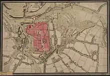 To the west of the salthouse stood the main guardhouse from 1676 to 1847. It was extended in 1704 and 1740. From 1640 to 1650 the guard was located north of the monastery church. With the expansion of the Kaisertrutz by the Prussians, the main guard and the military arsenal moved from the salthouse to the Kaisertrutz in 1850.[1]: 382