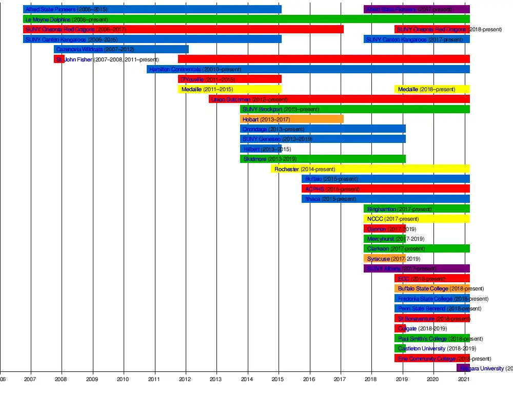 | Erie Community College | Williamsville, New York | 1946 | Community College | 13,649 | 2018 | Kats | 2019 | Cheektowaga Recreation Ice Arena |