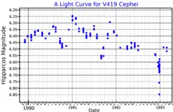 Billed as an irregular variable star of type LC, V419 Cephei's brightness varies between magnitudes 6.54 and 6.89 with no apparent periodicity.[3]