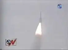 At 12h25m a.m. (UTC) the rocket was launched[lower-alpha 2] with a mass of 50 tons at the time of launch. Within about a minute the technicians noticed a problem with strap-on booster D, which caused the rocket to climb at an incline. Although the vehicle corrected the inclination, about seven tons of dead weight unbalanced the ascent, which led, 65 seconds after launch, to the remote destruction of a satellite worth $5 million and a $6.5 million rocket.[18][11][19] It was later revealed that of the four boosters, one was not engaged, causing it to go off course.[20] The rocket was destroyed at a height of 3,230 metres (10,600 ft), and its debris fell into the interdicted sea area about 2 kilometres (1.2 mi) from the launch pad.[11] At the time of the destruction, the rocket was going 700 km/h.[21][lower-alpha 3]