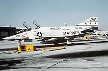 On 1 February 1966, The squadron was again redesignated as Marine All Weather Fighter Squadron 333 (VMF(AW)-333) when they received new all-weather versions of the F-8 Crusader. The squadrons last name change came on June 20, 1966 when they became Marine Fighter Attack Squadron 333 (VMFA-333) as they transitioned to the F-4 Phantom II. On June 5, 1972, VMFA-333 departed Naval Air Station Oceana for a six month deployment on board the USS America (CVA-66). The America arrived at Yankee Station off the coast of South Vietnam on July 13, 1972 and VMFA-333 began flying combat sorties the next day.[1] It was during this deployment that the squadron got its only air-to-air kill when Major Lee T Lasseter, USMC along with his RIO, Capt. John D. Cummings shot down a MiG-21 over North Vietnam, near Hanoi. After the shoot down both aircraft were damaged by flak and an SA-2 SAM, which hit 5526 in the tail section. Close to running out of fuel and with 5526 on fire from the SAM hit, the pilots ejected just south of Haiphong Harbor. The incident was also the first and only all-Marine kill during the Vietnam War. Two other Marines shot down MiGs but they were on exchange with the Air Force.[2] Until 1978 the squadron remained affiliated with Carrier Air Wing 8 and made a 1976 deployment aboard the USS Nimitz (CVN-68). Major Lee T. Lasseter later assumed command of VMFA-333 and was named Marine Aviator of the year for 1972.