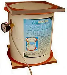 "Vacuum is the process of using vacuum to remove gases from compounds which become entrapped in the mixture when mixing the components."[2] To assure a bubble-free mold when mixing resin and silicone rubbers and slower-setting harder resins, a vacuum chamber is required. A small vacuum chamber is needed for de-airing (eliminating air bubbles) for materials prior to their setting. The process is fairly straightforward. The casting or molding material is mixed according to the manufacturers directions.