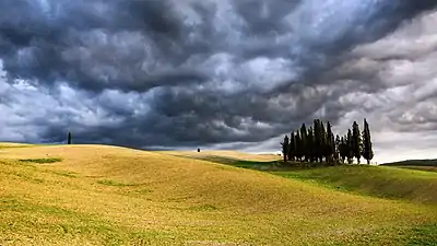 The Val d'Orcia or Valdorcia (Italian pronunciation: [ˌvalˈdortʃa]) is a region of Tuscany, central Italy, which extends from the hills south of Siena to Monte Amiata. Its gentle, cultivated hills are occasionally broken by gullies and by picturesque towns and villages such as Pienza (rebuilt as an "ideal town" in the 15th century under the patronage of Pope Pius II),[1] Radicofani (home to the notorious brigand-hero Ghino di Tacco) and Montalcino (the Brunello di Montalcino is counted among the most prestigious of Italian wines).[2] Its landscape has been depicted in works of art from Renaissance painting to modern photography.
