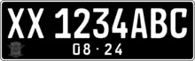 The former design of Indonesian registration plates only for private vehicles that uses customized vehicle registration numbers from August 2019 to June 2022.[3] The Indonesian Police Traffic Corps logo is printed on the lower left and more prominent.