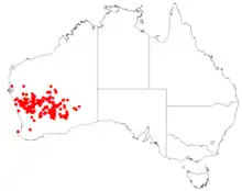 It occurs in the IBRA regions of Yalgoo (YAL), Murchison (MUR), Great Victoria Desert (GVD), Coolgardie (COO), Carnarvon (CAR), Gascoyne (GAS), Nullarbor (NUL), Geraldton Sandplains (GS) and Avon Wheatbelt (AW).[4]