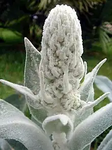 Verbascum bombyciferum, called the giant silver mullein, Turkish mullein and Broussa mullein, is a species of flowering plant in the genus Verbascum, native to Turkey, and introduced to California, Great Britain and Germany.[2] It is considered a good plant to attract pollinators.[3] With Verbascum chaixii it is a parent of the 'Pink Domino' cultivar, which has gained the Royal Horticultural Society's Award of Garden Merit.[4]