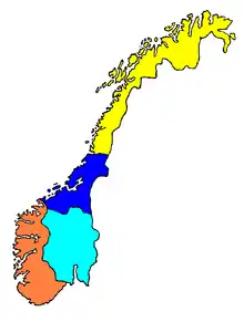 Vestlandsk or Vestlandske dialekter (West Norwegian) is a collective term for the dialects that are spoken on the coast of western Norway in the area ranging from Romsdal in the north to Agder in the south. These dialects can furthermore be split into north-western dialects (Nordvestlandske dialekter), south-western dialects (Sørvestlandske dialekter) and southern dialects (Sørlandske dialekter).[2]