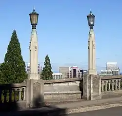 |  Detail of light standards and benches mid-span, and view of downtown and east Portland | |