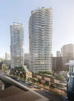 Lexas had planned to begin construction in 2010, but progress was hindered by the search for a major financial investor amid the economic recession.[8][9] The city government granted a master-use permit to Lexas for the project in 2012 with a four-year expiration date.[4][10] The Westbank Corporation of Vancouver submitted a revised design to the city in September 2015, proposing a pair of 38-story towers with 892 residential units without a hotel.[4] The company purchased the triangular project site for $52.8 million in October and unveiled a "wave-like design" by Henriquez Partners Architects a month later.[11][12] An additional $297 million in financing from an unnamed pension fund was also announced in 2019 by DSC Capital.[13] The project is expected to cost $381 million in total to construct.[14]