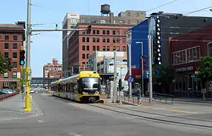 Warehouse District/Hennepin Avenue station viewed from the corner of Hennepin Avenue and S. 5th Street (prior to the extension to Target Field station)