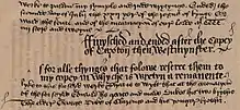 For a long time the chronicle was known from only a single manuscript, Cambridge, Peterhouse, MS 190, fols. 214v – 225r.[1] Not until 1972 was a second copy discovered, by Lister M. Matheson, in Glasgow Library, MS Hunterian 83, fols 141r – 148v; the chronicle had been overlooked since the catalogue of Hunterian manuscripts incorrectly listed its contents. In both manuscripts, Warkworth follows the Brut Chronicle, as a continuation;[2] that version of the Brut ended in 1419 and is continued until 1461, with the additional text pulled from one of the Chronicles of England printed by William Caxton, itself a continuation of the Brut.[3] Matheson concluded that the continuation in Hunterian 83, covering the years 1461–1474, was added to the manuscript in 1484, and was thence copied into Peterhouse 190, likely under Warkworth's supervision.[2] A third manuscript, British Library MS. Harley 3730, is incomplete but contains material similar or identical to that of the Hunterian and Peterhouse manuscripts.[4]
