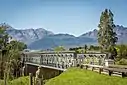 From top, Wellington CBD, with the NG Mother Church and snowy Wemmershoek Peak beyond. Dutch Reformed Church Complex in Wellington (centre left). Lady Loch Bridge over the Berg River (centre right). Coronation Arch in Victoria Jubilee Park (bottom left). Second Boer War block house (bottom right). | |