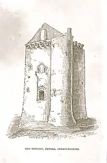The main concentration of tower houses is in southern Pembrokeshire, Wales. These were first published with detailed drawings in 1877–8 by Rev. E L Barnwell.[2] The Pembrokeshire examples have a coastal distribution; this is also true of the Monmouth and Glamorgan tower houses, as well as the demolished examples at Penhryn (in Caernarfonshire) and Ty Gwyn (in Abermo).[3] Otherwise, the tower houses are distributed along the Welsh—English border, with one example, Wattlesborourgh, just over the border in Shropshire. In 1976, Hilling produced a map (with listing) showing seventeen examples.[4] Further houses have been added by Suggett and it is possible that new examples will be recognised as being incorporated into existing buildings, as at Sandyhaven House in Pembrokeshire.[5]