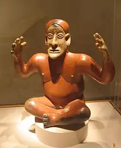 - "Chinesca" or "Chinesco" figurines were named by art dealers after their supposed Chinese-like appearance. An early type, Chinesco is identified with Nayarit[19] and up to five major subgroups have been identified, although there is considerable overlap.[20] Type A figurines, the so-called "classic Chinesco",[21] are realistically rendered. One prominent curator, Michael Kan, finds that "their calm, subtle exterior suggests rather than demonstrates emotion".[22] These Type A figures are so similar to one another that it has been suggested that they were the production of a single "school".[23] Types B through E are more abstract, characterized by puffy, slit-like eyes blended into the face, and broad rectangular or triangular heads. These figures are often shown seated or reclining, with shortened bulbous legs quickly tapering to a point.[24]