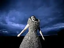 The video is divided into scenes in the day and night in a desert, with Björk wearing the bell-shaped dress designed by McQueen,[25] dancing playfully to the song. At some moments of the video she can be seen playing bells and holding two Siberian Huskies. Throughout the clip, several children can be seen playing bells and dressed in clothes covered in small jingle bells. The bell choir was formed by Júnia, Salka, Kaktus, Örnólfur, Daði and Gabríel of The Bústaðakirkja Bell Choir.[2] The version of the song played in the video is different from the album version, removing almost all the vocal music and replacing it with bells.[23] The bell-shaped dress was shown in Björk's MoMA retrospective in 2015.[26] It was sold for £44,000, as part of Kerry Taylor Auctions "Passion for Fashion" sale in London, in June 2016.[27]