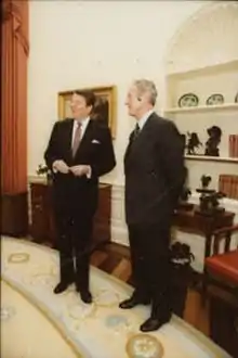 A close friend of President Ronald Reagan, Wilson was appointed on the 11th of February 1981 as the personal representative of the President to the Holy See, when the United States still did not have full diplomatic relations with the Vatican. At the time, a 1867 U.S. Anti-Catholic law which had prevented the U.S. from establishing relations with the Vatican, was still in effect.[2] In 1984, the law was repealed. Following this, Reagan nominated Wilson as the first United States Ambassador to the Holy See on January 10.[3]