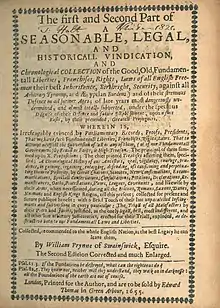 - ↑ William Prynne (1655), The First and Second Part of a Seasonable, Legal, and Historicall Vindication, and Chronological Collection of the Good, Old, Fundamentall Liberties, Franchises, Rights, Laws of All English Freemen Their Best Inheritance, Birthright, Security, against All Arbitrary Tyranny, and Ægyptian Burdens) and of Their Strenuous Defence in All Former Ages; of Late Years Most Dangerously Undermined, and almost Totally Subverted, under the Specious Disguise of Their Defence and Future Establishment, upon a Sure Basis, by Their Pretended, Greatest, Propugners. Wherein is, Irrefragably Evinced by Parliamentary Records, Proofs, Presidents, that We Have such Fundamentall Liberties, Franchises, Rights, Laws. That to Attempt or Effect the Subversion of All or Any of Them, (or of Our Fundamentall Government) by Fraud or Force, is High Treason. [...] Collected, Recommended to the Whole English Nation, as the Best Legacy He Can Leave Them (2nd corr. & much enl. ed.), London: Printed for the author, and are to be sold by Edward Thomas in Green Arbour, OCLC 15871789.