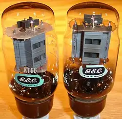 Valve complement of the original Williamson amplifier was determined by scarce supply in wartime Britain. The two suitable and available output valves were either the PX25 triode, or a triode-connected KT66 beam tetrode.[24] Williamson initially used the PX25, an already obsolete directly-heated triode introduced in 1932.[25][lower-alpha 5] In his second prototype, Williamson used the more efficient KT66, which became the valve of choice in post-war period. Powered from +500 V power supply, the KT66 prototype delivered 20 Watts at no more than 0.1% distortion.[25] A less costly +425V power supply enabled 15 Watt output power at no more than 0.1% distortion; this arrangement became standard for the Williamson amplifier and defined its physical layout.[25] The complete prototype system, including the amplifier, the experimental magnetic pickup and a Goodmans full-range speaker in an acoustical labyrinth enclosure, has proven to Williamson that a low distortion, deep feedback amplifier, indeed, sounded superior to amplifiers without feedback.[17] The difference was particularly audible with the best available shellac records, despite the physical limitations of this low-fidelity format.[17]