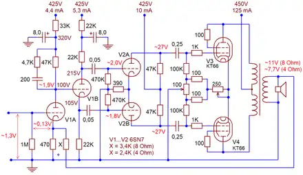 The Williamson amplifier is a four-stage, push-pull, class A triode valve amplifier built around a high quality, wideband output transformer.[59] Its second (concertina-type phase splitter, V1B), third (driver, V2A and V2B) and fourth (output, V3 and V4) stages follow Cocking's Quality Amplifier circuit. The added first stage (V1A) is a dedicated error amplifier, which compensates for the loss of gain caused by negative feedback.[60] Williamson optimized operating points of each stage for best linearity with sufficient overload reserve.[60] The output stage is biased into pure class A; traditionally it used triode-connected beam tetrodes or pentodes. With American 807 or British KT66 valves (Williamson recommended the latter type[61]) and specified power supply the amplifier delivered 15 watts of output power. Further increase in output, according to Williamson, required use of four output valves; his 1947 article mentions construction of a 70-watt prototype.[58]