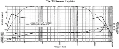 The first attempts to build the Williamson amplifier revealed its tendency to oscillate due to very narrow phase margin. Astor and Langford-Smith, who gave the Williamson excellent ratings,[48] reported that "for fairly large outputs at low frequencies a high frequency oscillation about 60 kC/s [kHz] would commence and be accompanied by a pulsed output of some other frequency".[74] The Australians, armed with first-class test equipment,[lower-alpha 13] suppressed the 60 kHz oscillation with small capacitors on screen grids, but could not identify and suppress the cause of "some other" oscillations.[74] Later, technicians of the United States Naval Research Laboratory examined seven different commercially available Williamson amplifiers, and found that all of them oscillated at infrasonic frequencies of 2...3 Hz.[75] Replacement of output transformers affected stability only at audio and ultrasonic frequencies.[75] The best transformers displayed perfectly flat frequency response from 10 to 100,000 Hz, but were also prone to infrasonic "breathing".[75] The worst transformers displayed prominent ultrasonic resonances that, however, did not cause sustained oscillations. Some "ringed" at relatively low frequencies of 30 to 50 kHz, others extended into 500...700 kHz range.[76]