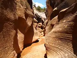 Willis Creek is a creek in Bryce Canyon National Park, Dixie National Forest, and the Grand Staircase–Escalante National Monument in Garfield and Kane counties in southern Utah, United States. The creek rises in the national park in Garfield County, but quickly heads south out of the park to enter the national forest and Kane County. The course of the creek then curves to the east and enters the national monument, were it eventually runs through a wash, which in some sections narrows to become a slot canyon. This slot canyon is officially known as the Willis Creek Slot Canyon and it is a 5.8 mile hike that is accessible at the Willis Creek Slot Canyon Trailhead.[1] This creek is popular with hikers as the stream is generally 1-2 inches deep and a trail runs the length of the creek.[2] The end of the creek is dry.[2]