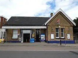 Winchmore Hill railway station is on Station Road (which, before the arrival of the railway, was known as "Middle Lane"), Winchmore Hill in the London Borough of Enfield in North London, England, in Travelcard Zone 4. It is 7 miles 63 chains (7.79 miles, 12.53 km) down the line from London King's Cross[2] on the Hertford Loop Line. The station, and all trains serving it are operated by Great Northern. Originally, upon opening in 1871, the station building was almost identical to that at neighbouring Palmers Green. However, in 1965 the northbound side of the building was demolished due to subsidence.[3] In the 1970s the station boasted, on its southbound platform, a small newsagent and sweet shop, just beyond the base of the stairs down to the platform, but by 1980 this shop had been dismantled.
