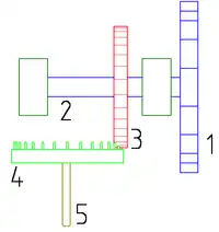 Windshaft connected to other parts. 1=sails; 2=windshaft; 3=brake wheel, 4=crown wheel with cogs; 5=vertical or main shaft.