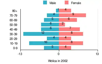 According to the 2002 Poland census, there were 105 people residing in Wolica village, of whom 50.5% were male and 49.5% were female. In the village, the population was spread out, with 23.8% under the age of 18, 34.3% from 18 to 44, 14.3% from 45 to 64, and 27.6% who were 65 years of age or older.[1]