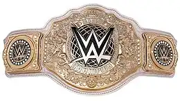 When the title became the Women's World Championship in June 2023, it adopted a near-identical design to the men's World Heavyweight Championship that had been introduced in April, albeit smaller, on a white strap, and with a small banner above the "World" banner that says "Women's". It also retains the customizable side plates.[6]